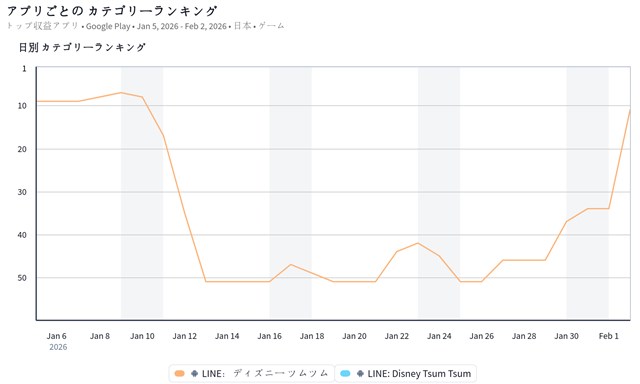 また、LINEヤフー<4689>とNHN PlayArtの『LINE:ディズニー ツムツム』が前日の34位から11位に急上昇し、トップ10に迫った。『ツムツム』は、2月1日0時より、ボイス付き新ツムの「クラウド KH2ver.」と「王様 KH2ver.」が期間限定で登場していることが足元の順位上昇につながっているもよう。