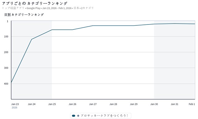 また、セガが1月22日にリリースした新作『プロサッカークラブをつくろう!』が21位とトップ20入りを目前にとらえてきた。サッカークラブ育成シミュレーションゲームの金字塔とも言える人気シリーズの最新作となる『サクつく』は、App StoreとSteamでは既に上位にランクインを果たしており、Google Playのセールスランキングでも満を持してのトップ20入りとなるのかどうか、今週の動向が注目される。