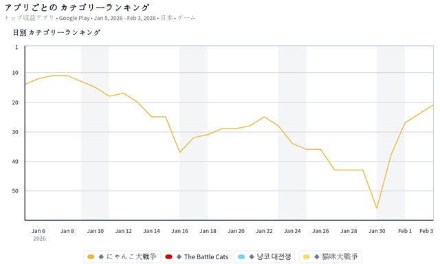 トップ20圏内に目立った動きがない中で、ポノスの『にゃんこ大戦争』が前日の24位から21位に上昇し、トップ20圏内をうかがう位置に付けたきた。『にゃんこ大戦争』は、1月30日11時より、アニメ「鬼滅の刃」とのコラボイベントを開始しており、主人公の「竈門炭治郎」など8名のコラボ限定キャラクターがレアガチャに登場していることなどが足元の売上に寄与しているもようだ。