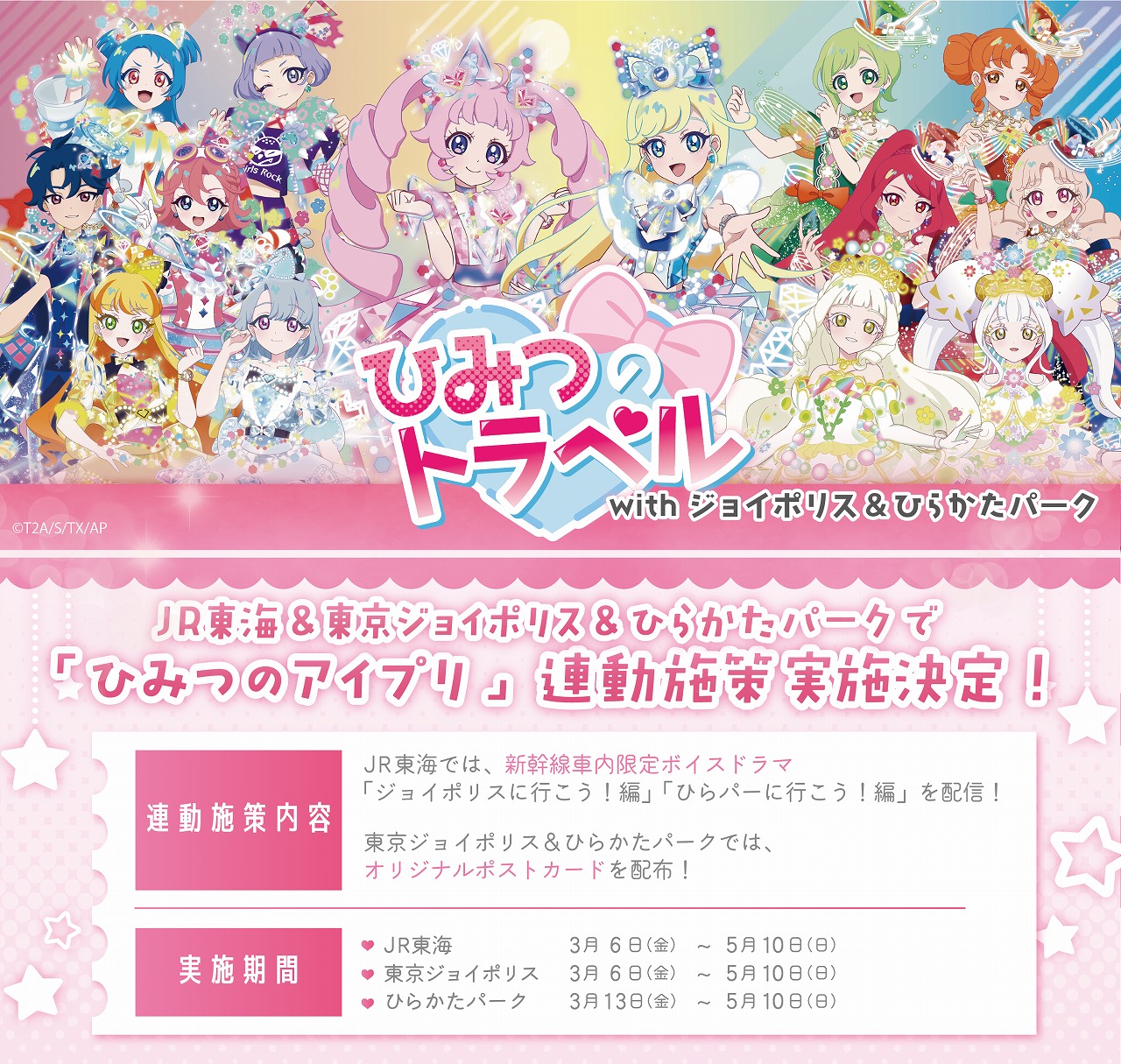 同時期に『ひみつのアイプリ』とコラボレーションを行う、「JR東海&東京ジョイポリス&ひらかたパーク」の連動施策「ひみつのトラベル with ジョイポリス&ひらかたパーク」が実施決定。詳細は後日公開となる。