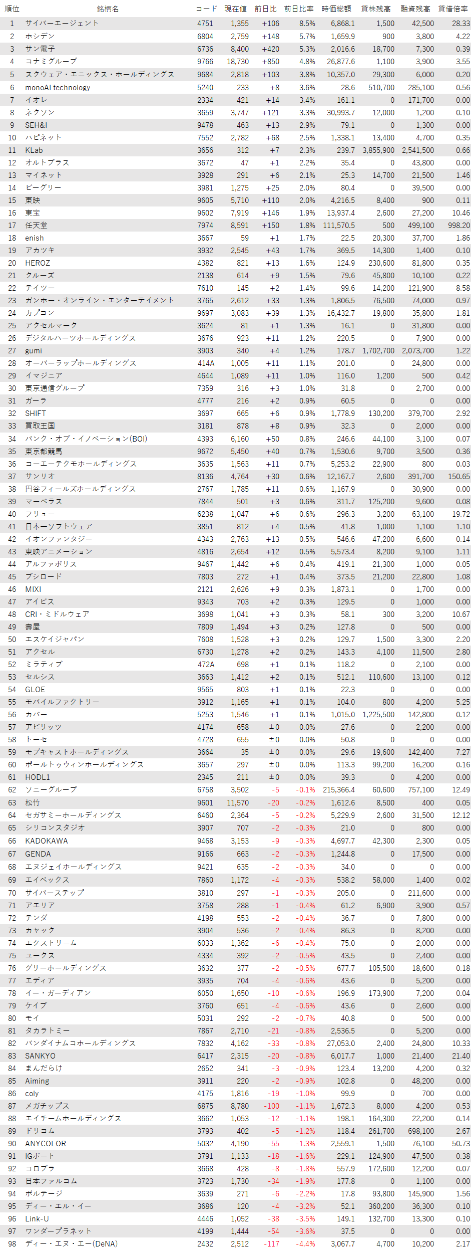 こうしたなか、ゲーム・エンタメ関連企業をみると、登録されている98銘柄のうち、上昇は56銘柄(57%)、下落は37銘柄(38%)、変わらずは5銘柄(5%)で、買い優勢だった。