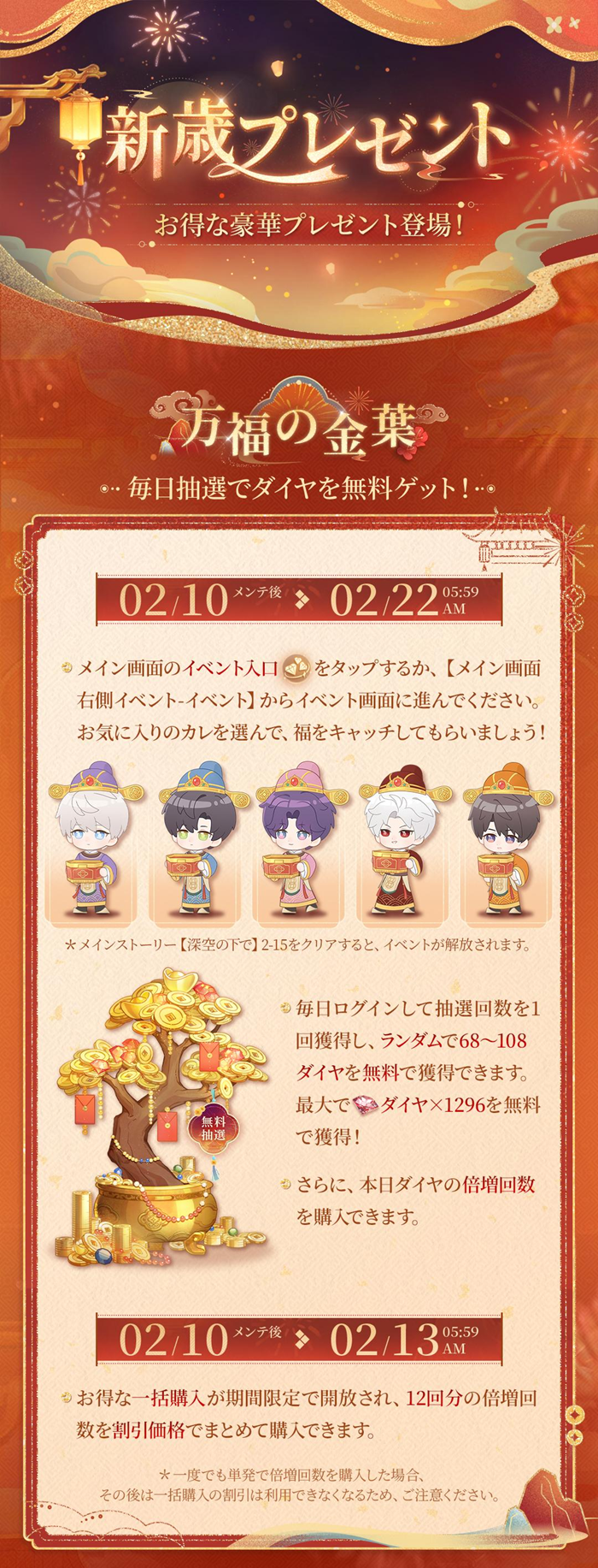イベント説明:絢爛たる歳宴、家々に満ちる財福!イベントに参加することで【深空願い券・限定×10】、【ダイヤ×500】、【限定秘蔵品】、「私」の普段着【風が残す私】、【共通アクセサリー】、【限定称号】を含む様々な報酬を無料で獲得できる。また、カレからの特別メッセージとSNS投稿も開放される。