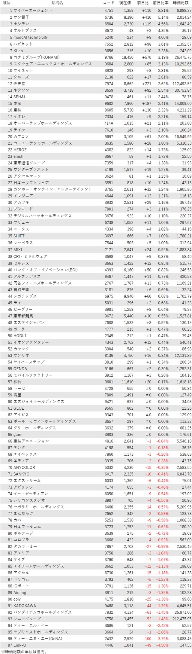 半面、DeNA<2432>やLink-Uグループ<4446>が安く、ソニーグループ<6758>やバンダイナムコHD<7832>などがさえない。