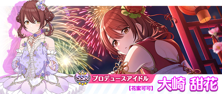 大崎 甜花が登場する「期間限定 春よ、紅灯籠を咲かせて 甜花スタンプガシャPlus」を開催中。さらに、本ガシャの開催期間限定で、「新規SSRプロデュースアイドル専用称号」が獲得できる。