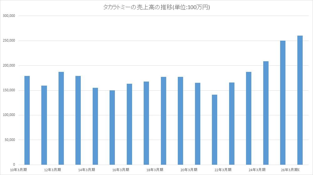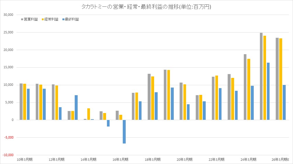 タカラトミー<7867>は、2月10日、2026年3月期連結業績予想の修正を行い、売上高2600億円(前回予想2600億円)、営業利益235億円(同220億円)、経常利益233億円(同218億円)、最終利益100億円(同140億円)、EPS112.37円(同156.01円)とした。