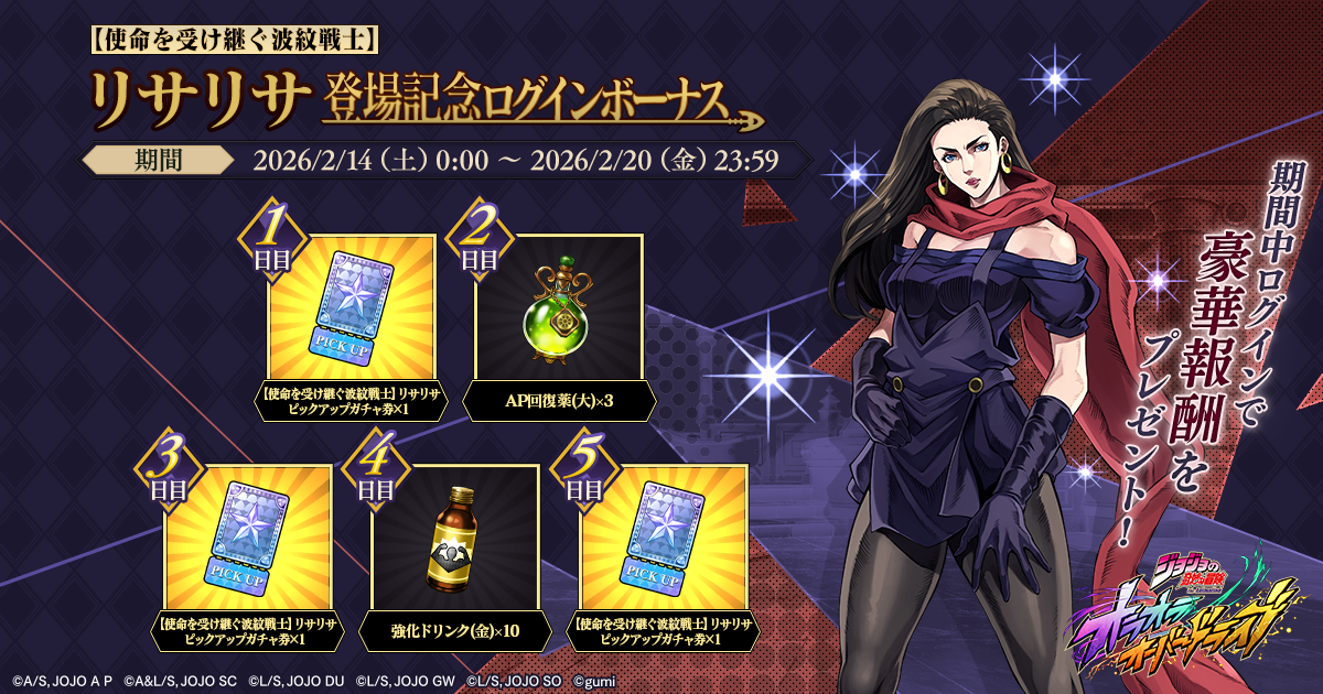 【使命を受け継ぐ波紋戦士】リサリサの登場を記念して、ログインボーナスを開催。期間中、ログインすることで「AP回復薬(大)」や「【使命を受け継ぐ波紋戦士】リサリサピックアップガチャ券」などの豪華報酬を獲得できる。