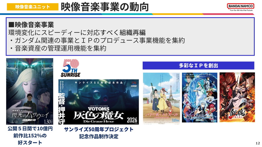 映像音楽事業は「機動戦士Gundam GQuuuuuuX(ジークアクス)」がヒットし、興行収入やライセンス収入が好調。グループ全体のガンダムビジネスにも大きく貢献した。「ブルーロック」「ワンパンマン」もグローバル展開が堅調だった。