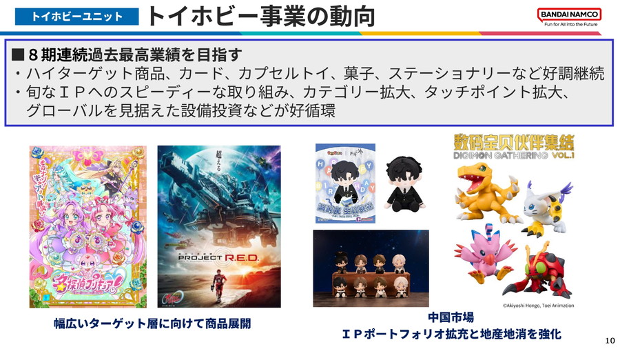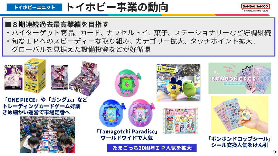 トイホビー事業は、ガンプラや一番くじなどのハイターゲット商品、カード、カプセルトイ、菓子食品、ステーショナリーなど各カテゴリーが好調を維持。「ガンダムシリーズ」が拡大したほか、「DRAGON BALL」「ONE PIECE」も高水準で推移した。