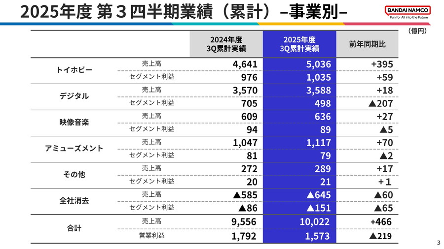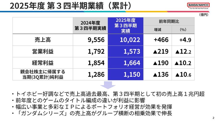 バンダイナムコホールディングス<7832>は、2月5日、2026年3月期 第3四半期決算を発表した。2026年3月期第3四半期累計(2025年4月~12月)の業績は、売上高1兆22億円、営業利益1573億円。第3四半期として初めて売上高1兆円を突破した。