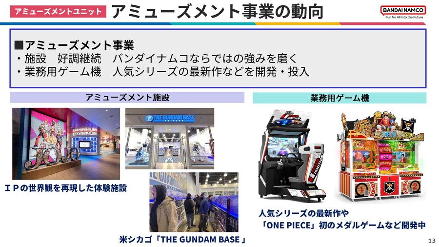 デジタル事業では、ネットワークコンテンツが安定収益基盤として厚みを増した。「DRAGON BALL」「ONE PIECE」「アイドルマスター」など既存タイトルが堅調に推移し、新作「SDガンダム ジージェネレーションエターナル」も好調。