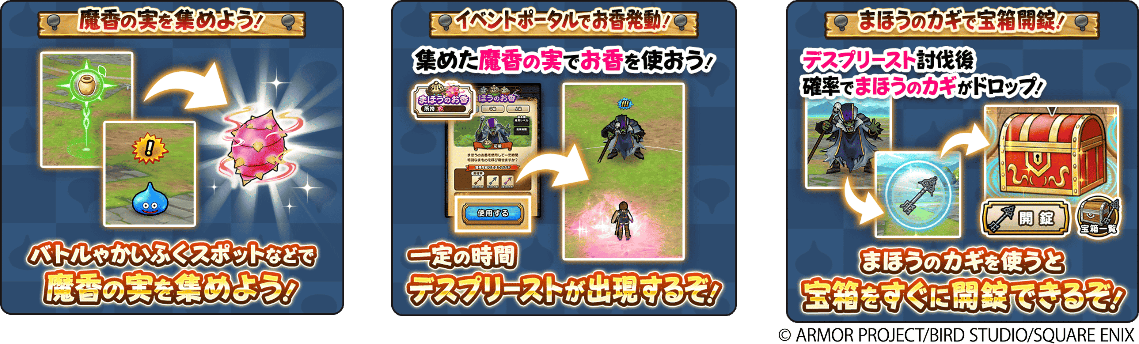 まほうのお香を炊くとフィールドに「デスプリースト」が出現。デスプリーストを倒すと「まほうのカギ」を落とすことがある。