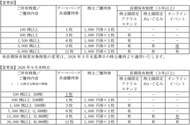 あわせて株主優待も変更する。従来、紙のチケットで配布していた、テーマパーク共通優待券と株主優待券を廃止し、サンリオグループ共通の会員サービス Sanrio+で取得できる「電子チケット(テーマパーク共通優待券)」と「電子クーポン(株主ご優待券)」を贈呈する。