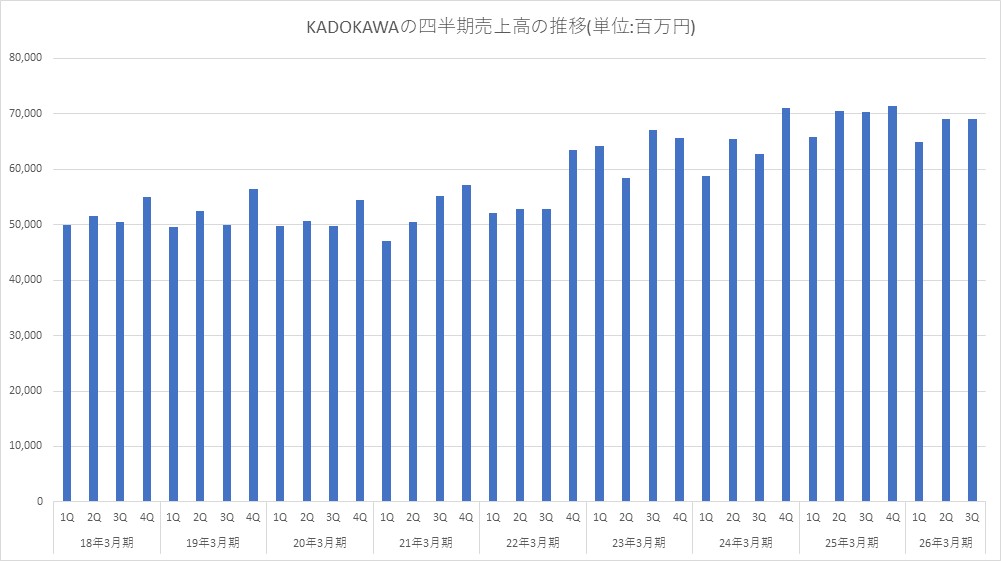 KADOKAWA<9468>は、2月12日、2026年3月期 第3四半期累計の連結決算を発表し、売上高2029億9100万円(前年同期比1.7%減)、営業利益63億7700万円(同59.7%減)、経常利益91億0700万円(同47.1%減)、最終利益22億1100万円(同70.0%減)だった。