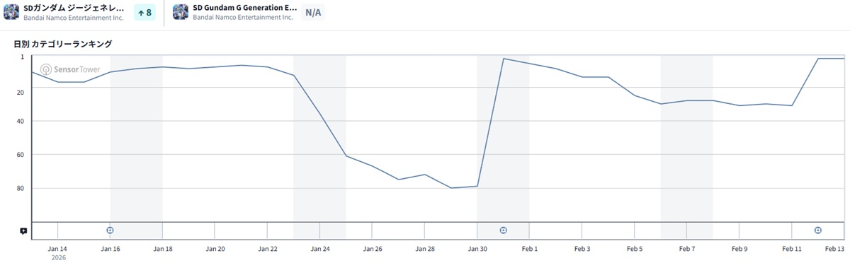 バンダイナムコエンターテインメントの『SDガンダム ジージェネレーション エターナル』が前日31位からトップ3に入った。
