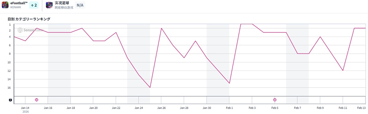 『ラストウォー:サバイバル』を追って、10ランクアップで2位につけたのが、コナミデジタルエンタテインメントの『eFootball』。