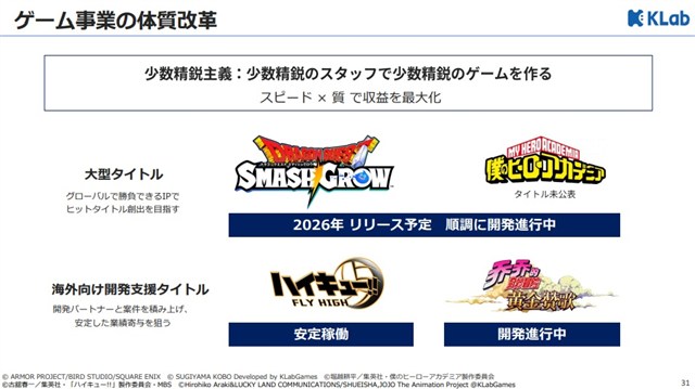 同社は、ゲーム事業の体質改革を2026年の経営方針として掲げており、「少数精鋭のスタッフで少数精鋭のゲームを作る」ことを目指している。現在、自社開発タイトルとしては大型タイトルの『ドラゴンクエストスマッシュグロウ』とTVアニメ「僕のヒーローアカデミア」シリーズの新作モバイルオンラインゲームの開発が進められている。
