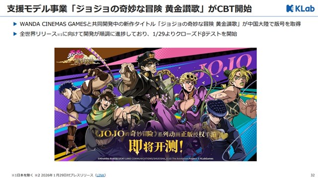 また、海外向け開発支援タイトルとしてWANDA CINEMAS GAMESとの共同開発が進行中の『ジョジョの奇妙な冒険 黄金讃歌』については、中国大陸での版号を取得し、全世界リリースに向けた開発が順調に進捗しており、1月29日よりクローズドβテストが開始されたとのことだ。