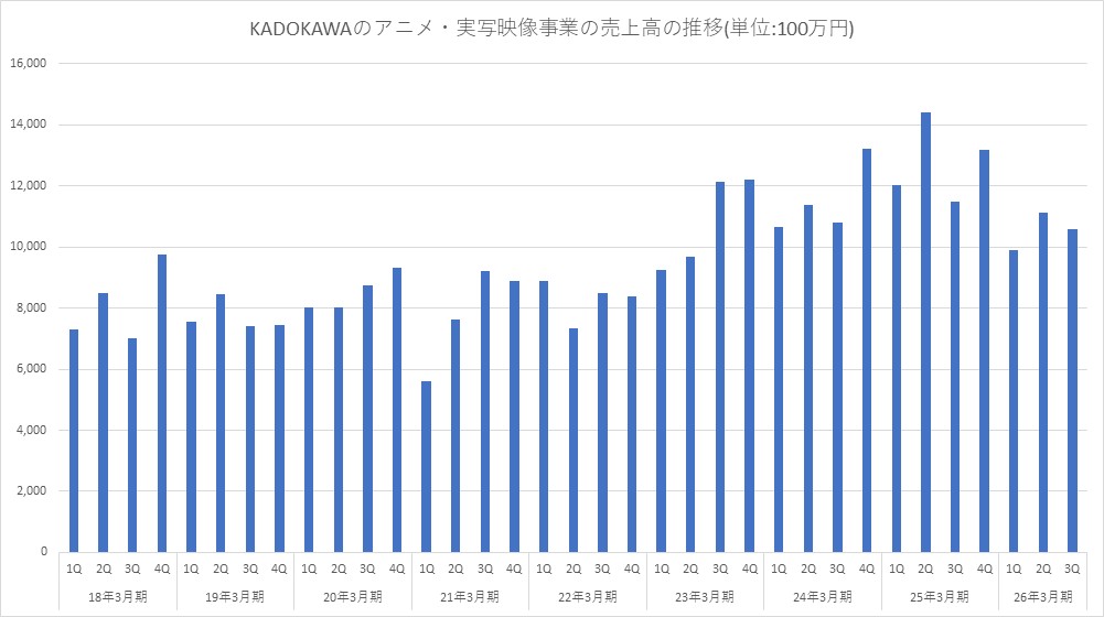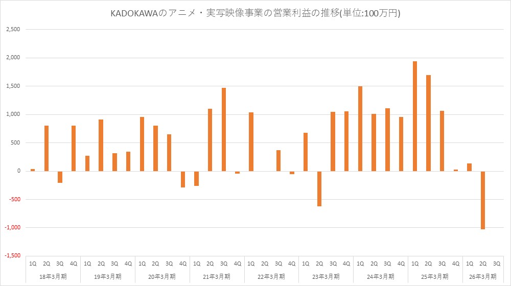 KADOKAWA<9468>は、第3四半期累計決算で損失計上したアニメ・実写映像事業について、第4四半期以降は複数の大型作品の放送・配信が控えており、着実な業績改善が見込まれると明らかにした。あわせて、製作費の高騰が継続する中、1タイトル当たりの収益拡大のために国内外の二次利用展開強化に引き続き注力していく。