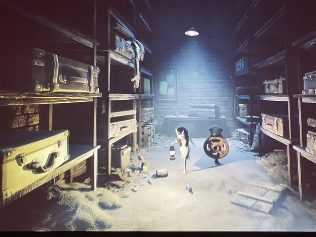 ▲大量にトランクが納められた部屋の棚からは、手のような奇妙なものが垂れている。