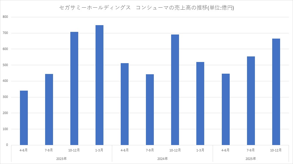 セガサミーホールディングス<6460>は、この日(2月13日)、第3四半期(25年4~12月)の「コンシューマ」の業績について、売上高が前年同期比1.0%増の1665億円、営業利益が同44.2%減の140億円と増収減益だったことを明らかにした。