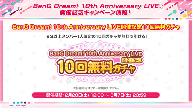 2月28日12時から「BanG Dream! 10th Anniversary LIVE開催記念 10回無料ガチャ」を開催する。開催期間の2月28日12時から3月7日23時59分までの間、★3以上のメンバーが1人確定で出現する10回ガチャを1回限り引くことができる。