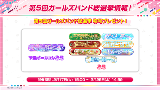 「第5回ガールズバンド総選挙 称号プレゼント!」の実施が決定した。2月17日15時から2月25日14時59分までにログインすることで、シャッフルバンド全8種の称号を受け取ることができる。なお、第5回ガールズバンド総選挙で1位となった「星降るティーパーティー」の称号はアニメーション称号となっている。