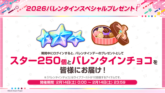 バレンタインを記念して、2月14日0時より「2026バレンタインスペシャルプレゼント!」の開催が決定した。2月14日0時から2月14日23時59分までにログインすることで、スター250個とバレンタインチョコを受け取ることができる。