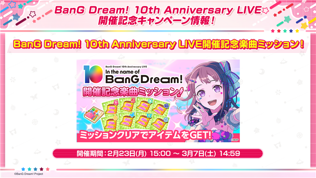 2月23日15時から「BanG Dream! 10th Anniversary LIVE開催記念楽曲ミッション!」を開催する。関連の楽曲ミッションをクリアすることで、各バンド専用のスキル練習チケットや裁縫セットを手に入れることができる。