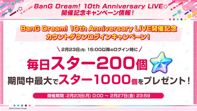2月23日0時から2月27日23時59分まで「BanG Dream! 10th Anniversary LIVE開催記念 カウントダウンログインキャンペーン!」を開催する。2月23日15時以降にログインすることで、毎日「スター200個」を受け取ることができる。開催期間中、合計5日間のログインをすることで最大「スター1000個」をプレゼントする。