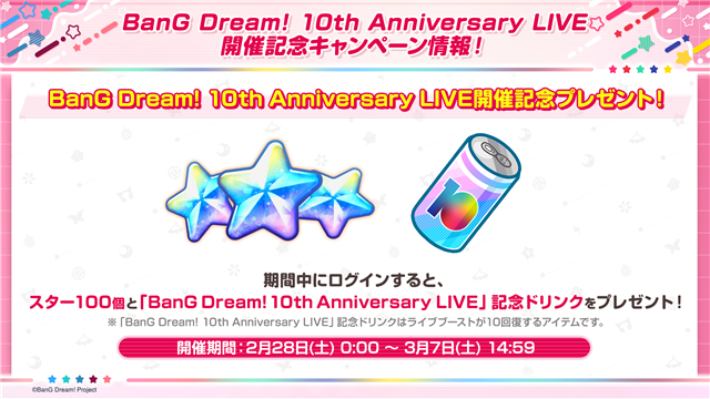 2月28日0時から「BanG Dream! 10th Anniversary LIVE開催記念プレゼント!」を開催する。開催期間の2月28日0時から3月7日14時59分までの間にログインすることで、スター100個と「BanG Dream! 10th Anniversary LIVE」記念ドリンクを受け取ることができる。