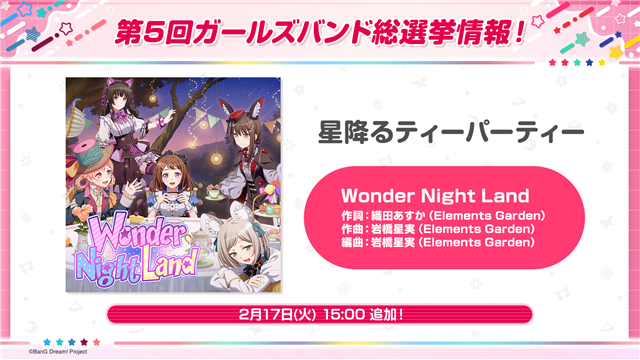 「第5回ガールズバンド総選挙 星降るティーパーティー第1位記念メンバープレゼント!」の実施が決定した。2月17日15時から2月25日14時59分までにログインすることで、星降るティーパーティーの★2メンバーを受け取ることができる。