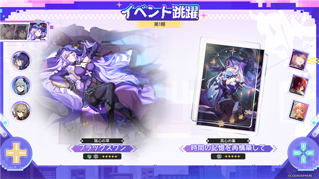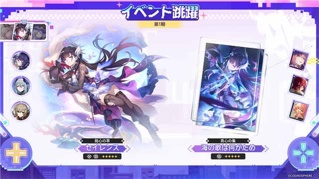 イベント跳躍「銘心の萃」も開催した!期間中「銘心の萃」にて、限定星5キャラクター「長夜月」(CV:小倉唯)、「セイレンス」(CV:石見舞菜香)、「ブラックスワン」(CV:生天目仁美)が再登場する。また再び彼らを入手できるチャンス!