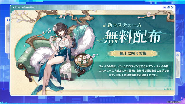 「ルアン・メェイ」のコスチュームを無料配布する。Ver.4.0の間に、ゲームにログインするとルアン・メェイの新コスチューム「紙上に咲く雪梅」を無料で受け取ることができる。