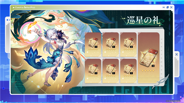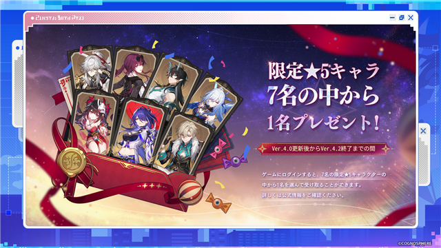 Ver.4.0更新後からVer.4.2終了までの間、ゲームにログインすると、限定★5キャラクター景元、カフカ、丹恒・飲月、鏡流、花火、黄泉、アベンチュリンの計7名の中から、1名を選んで受け取ることができる。