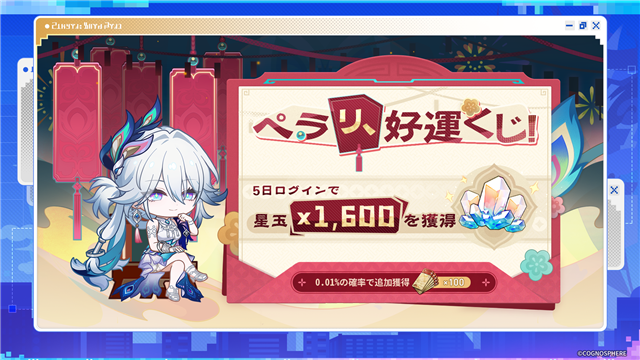 Ver.4.0更新後、イベント「ペラリ、好運くじ!」にて5日ログインすると星玉×1,600を獲得できる。さらに、0.01%の確率で「星軌専用チケット」100枚を追加で獲得できるチャンスも!?