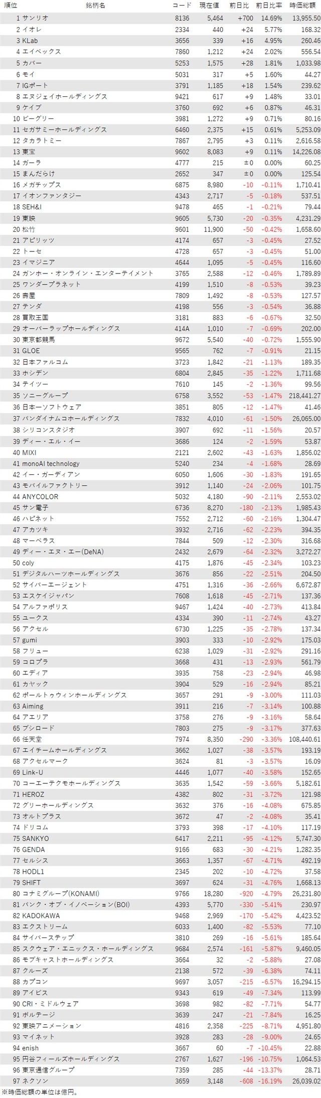 そうした中でゲーム・エンタメ関連株の動きを見てみると、下記の表に登録しているゲーム・エンタメ関連企業97銘柄のうち、上昇は13銘柄(13%)、下落は82銘柄(85%)、変わらずは2銘柄(2%)で、下落した銘柄が多数を占めた。