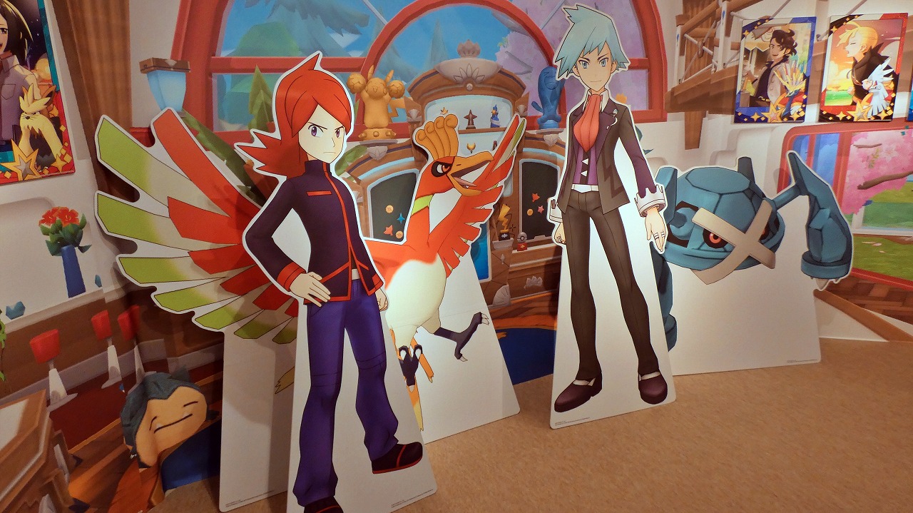 続いて、ゲーム内の憩いの場を再現した「トレーナーズサロン」エリアへ。ここではシルバー&ホウオウ、ダイゴ&メタグロスのスタイリッシュなスタンディが目を引く。さらに壁面には、チリ、ゼイユ、タロといった近年の人気キャラクターたちのメモリアルフォトパネルが展示されている。