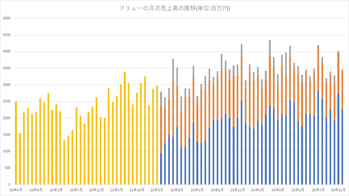 フリュー<6238>は、2月13日、2026年1月度のの月次概況(速報値)を公開し、売上高が前年同月比5.5%減の34億7000万円だったと発表した。ガールズトレンドビジネスが伸びたものの、世界観ビジネスが減収となったことが響いたという。2025年4月からの累計は前年同期比4.7%減の356億3100万円だった。