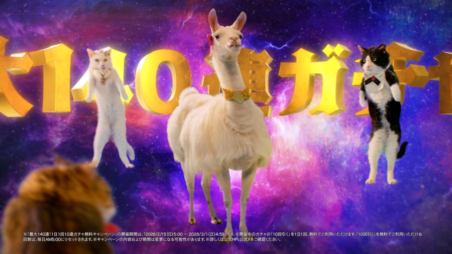 TVCMは、2月15日AM5:00より『プリンセスコネクト!Re:Dive』のゲーム内で開催する「最大140連!1日1回10連ガチャ無料キャンペーン」を紹介する内容となっている。過去の『プリンセスコネクト!Re:Dive』TVCM では【美食殿】が"猫の姿"で登場していたが、今回はなんと、リマ(CV:徳井青空)が"リャマの姿"で登場!?