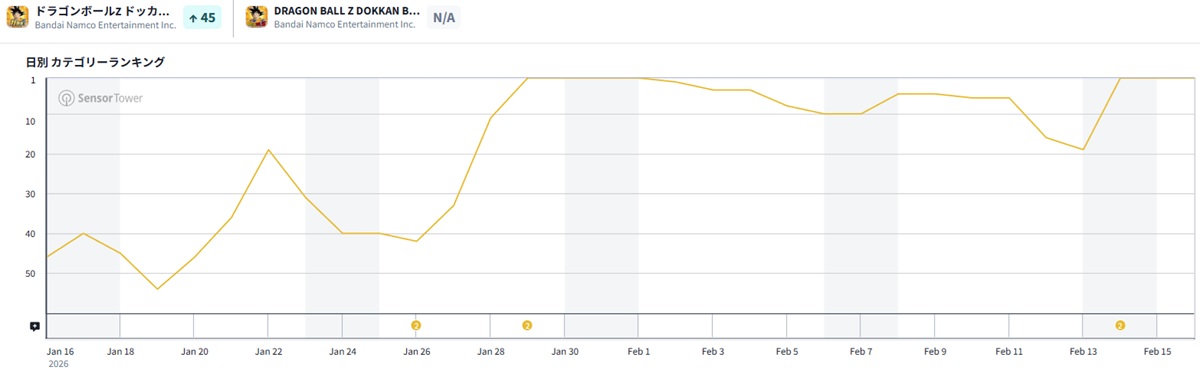 2月16日9時半現在のApp Storeセールスランキング(ゲームカテゴリー)は、バンダイナムコエンターテインメント『ドラゴンボールZ ドッカンバトル』がトップに立った。
