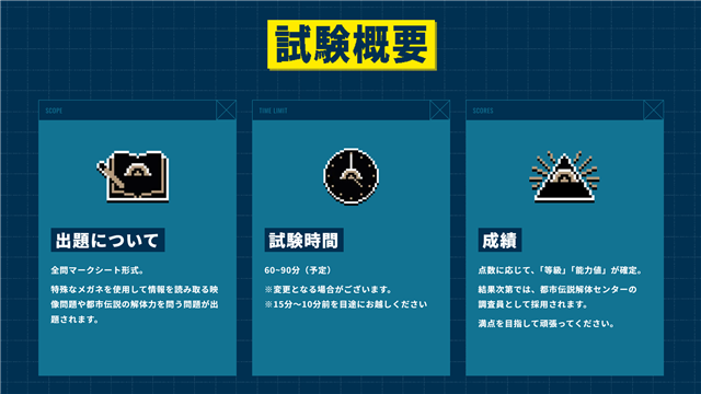 当イベントではその名の通り、『都市伝説解体センター』主催の“調査員募集試験(通称・センター試験)”を実施。試験では、SNS調査の技能や、都市伝説の知識や解体力を問う問題が出題され、実際に試験を受けることになる。