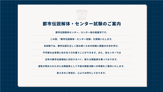 『都市伝説解体・センター試験』は、ミステリーアドベンチャーゲーム『都市伝説解体センター』(開発・墓場文庫 / 販売・集英社ゲームズ)の世界と現実世界の境界が曖昧となり、新たな物語が描かれる日常侵蝕型のイベント。