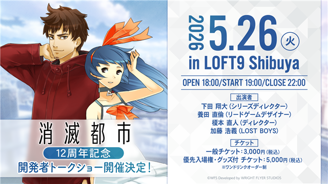 WFSは、『消滅都市』において、5月26日にリリース12周年を記念したリアルイベント「消滅都市12周年記念トークショー」をLOFT9 Shibuyaにて開催する。