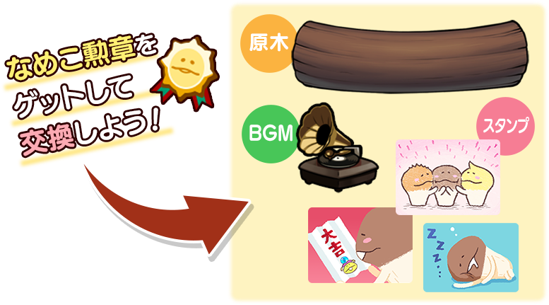 なめこ勲章は「みんなで栽培イベント」テーマの原木や輸入原木、スタンプ、BGMなどと交換可能。たくさんなめこを収穫してミッションをクリアし、勲章をゲットしよう!