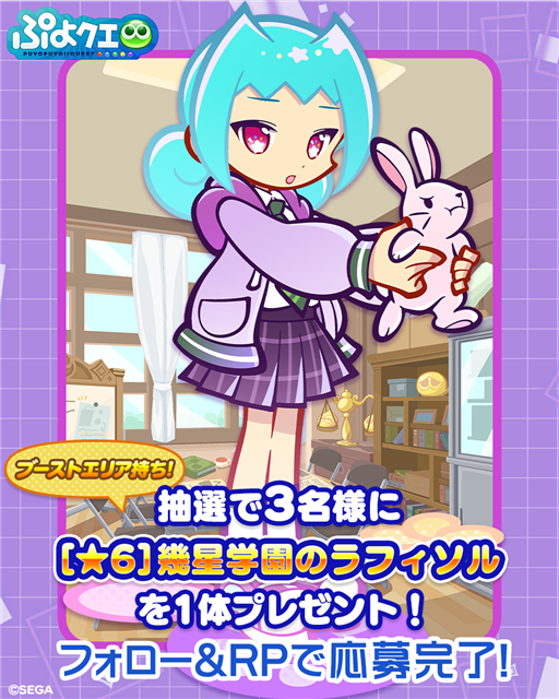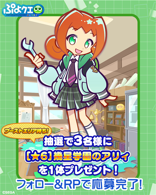 内容:『ぷよぷよ!!クエスト(ぷよクエ)』公式Xアカウントと公式Instagramアカウントにて、キャンペーンに参加した方の中から抽選でそれぞれ3名に、「[★6] 幾星学園のアリィ」「[★6] 幾星学園のラフィソル」をプレゼントするキャンペーンを開催する。