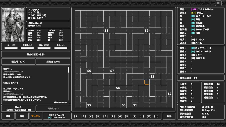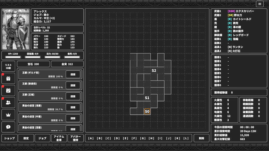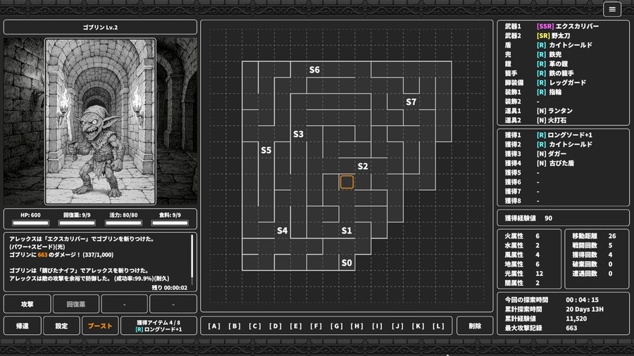 ・放置もOK: 探索中の行動選択は「手動/自動」のどちらも可能で、事前に方針を決めておけば、放置中でもキャラクターは探索を進めてくれる。