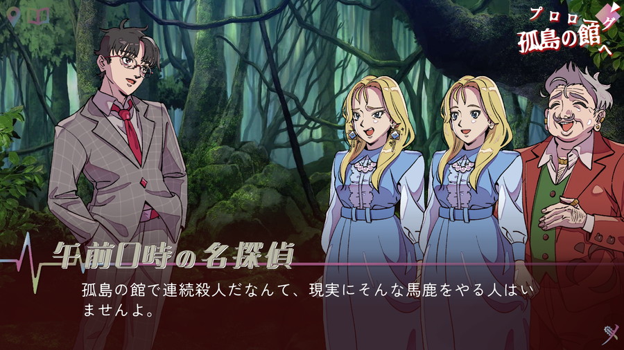 今回公開される体験版では、犯人(=あなた)が『孤島の館への招待状』を製作するゲームパートと、招待客とともに孤島の館に到着するまでのストーリーを楽しむことができる。