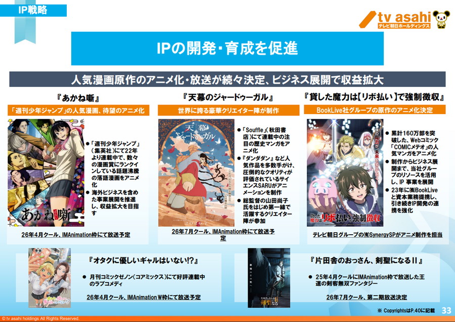 今回のIP戦略は、深夜帯改革「アフタープライム大作戦」とも連動する。深夜アニメ枠を拡大し、ショートアニメを含めた編成強化を進める。制作予算については、グローバル展開や新規事業につながる作品へ優先的に配分。その他の枠では、企画力やアイディア、クリエイター育成に重点を置く。
