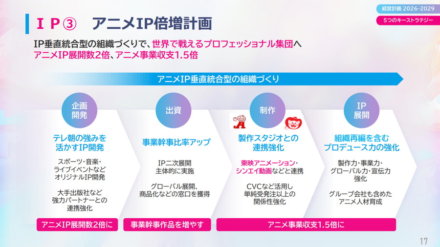 同計画では、アニメIPの展開数を現状の2倍に拡大するとともに、アニメ事業の収支を1.5倍に引き上げる目標を掲げた。単なる作品数の増加ではなく、企画・開発から出資、制作、展開までを一気通貫で手掛ける「IP垂直統合型」の体制構築を進める。