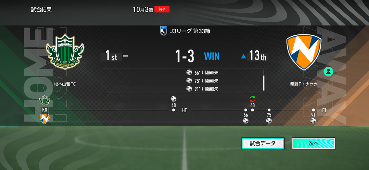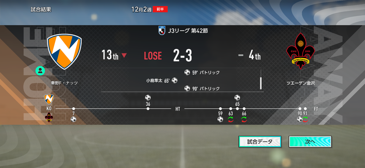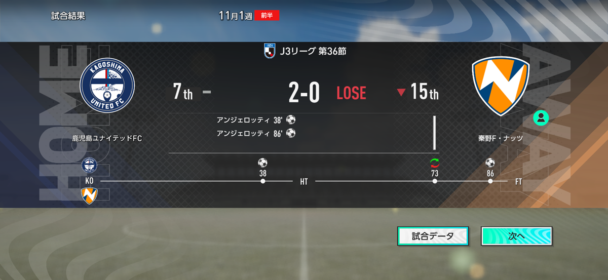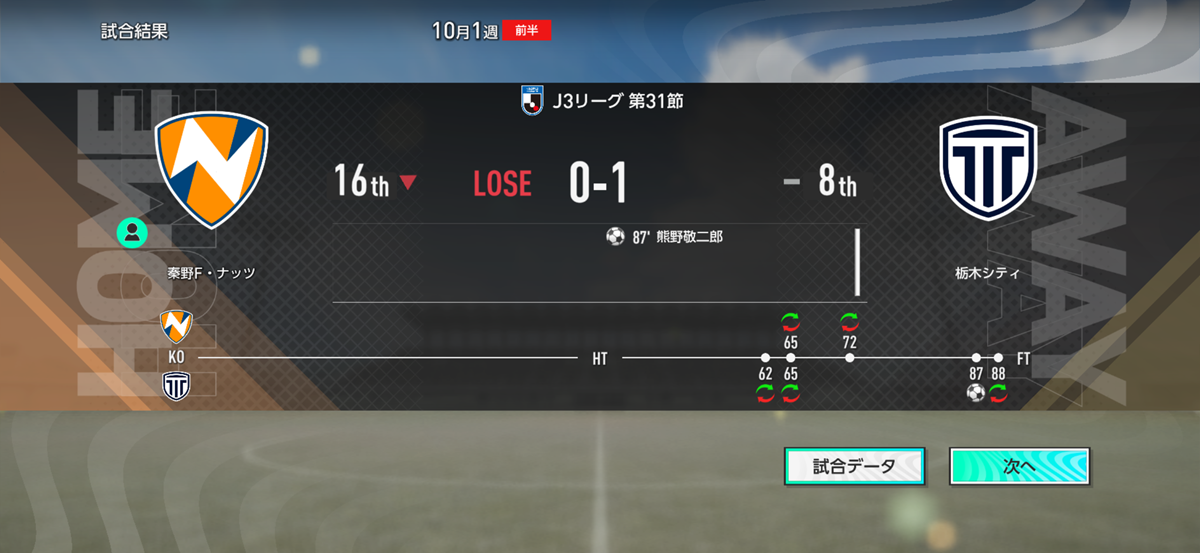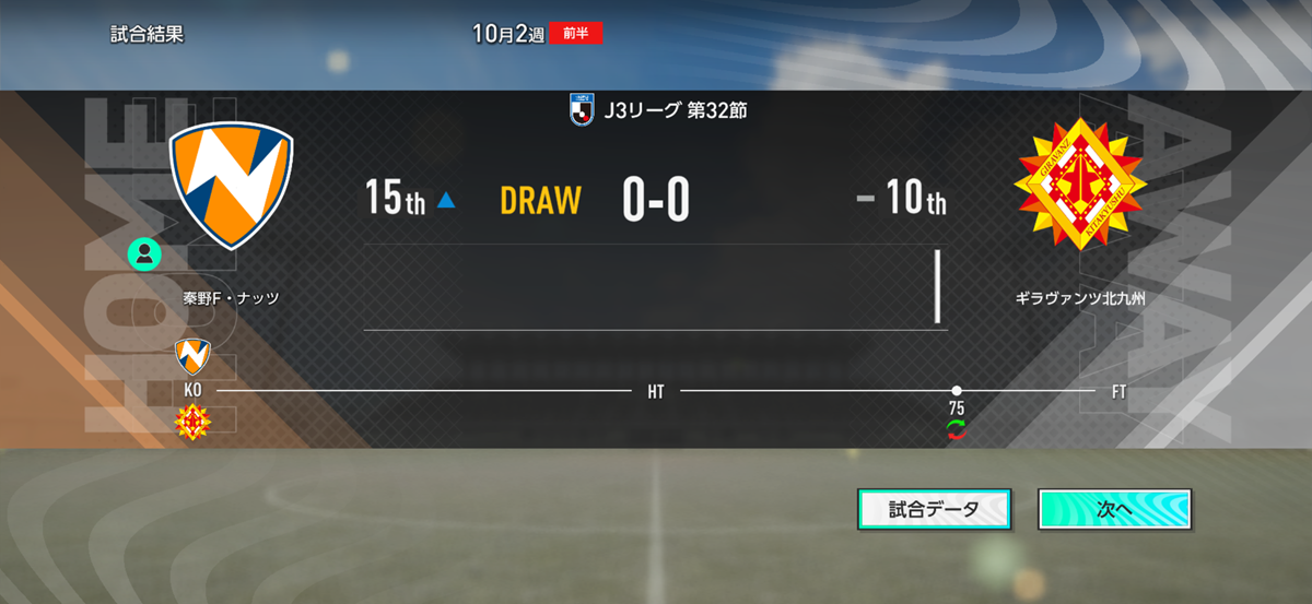 秦野キッズたちの無邪気な発言に奮い立ち、監督Lvが3になったので、色々と強化して迎えたJ3リーグ終盤戦。